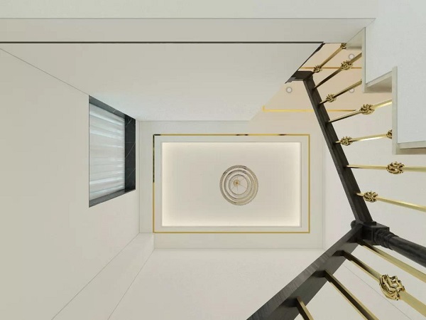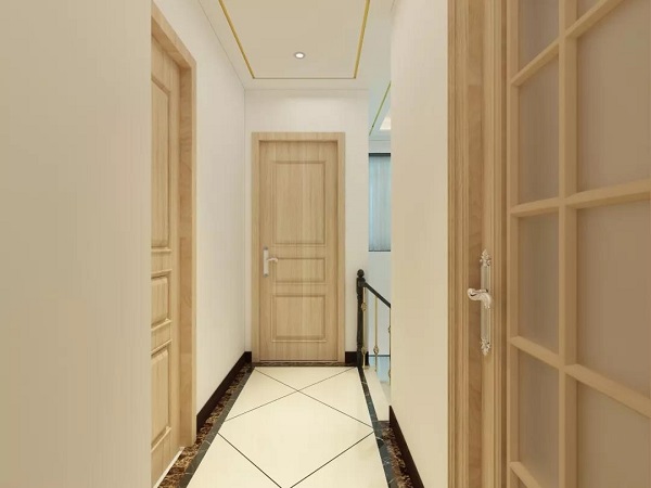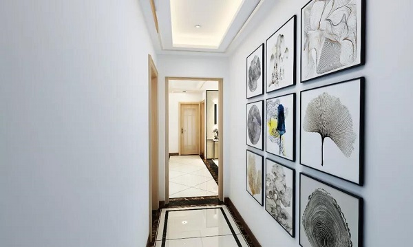 过道区域较为简单,围着过道地面一圈深色波导线,与上方吊顶形成一个对称的空间,墙面挂装饰画,使得整体空间不那么空旷。