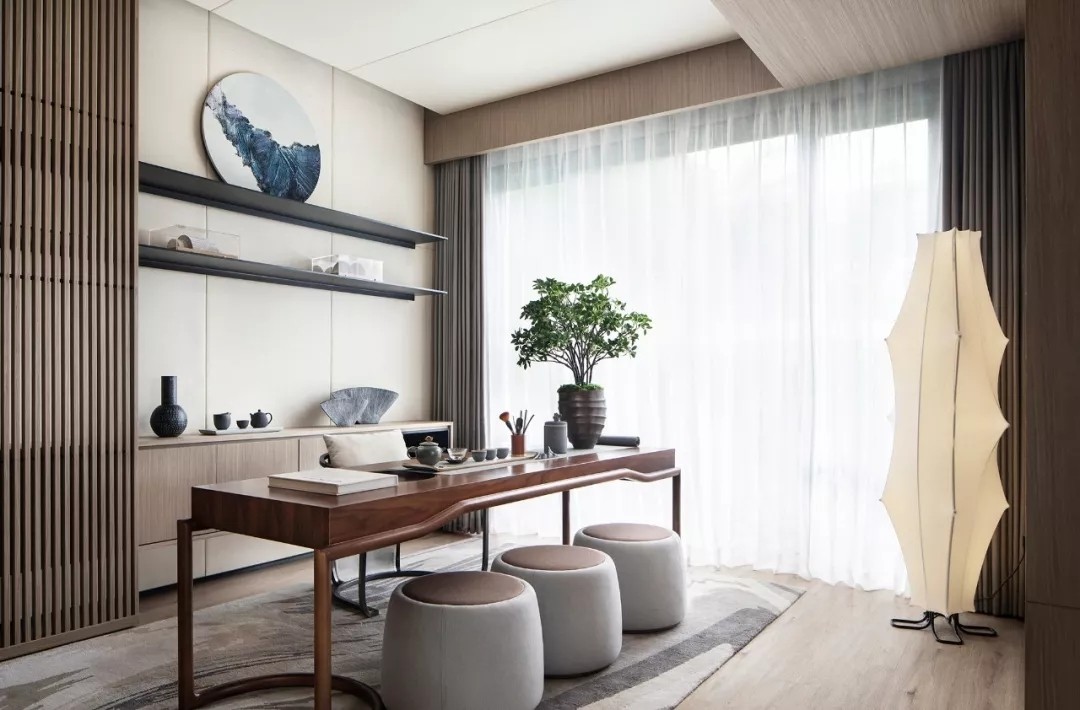 自水景庭院步入空间,书画创作交流区是居者艺术生活起笔的第一个诗意场域,摒弃了常规玄关的布设,设计师将书画空间营造为一个清朗雅隽的艺术生活方式安放地,超面宽的通透采光、大方疏阔的格局、宽大的面案桌台与米白色卷轴状的吊灯,丰富了诗性空间的柔和度。人在此间挥毫泼墨,写诗或绘画,艺术家的无垠想象力自由绽放。