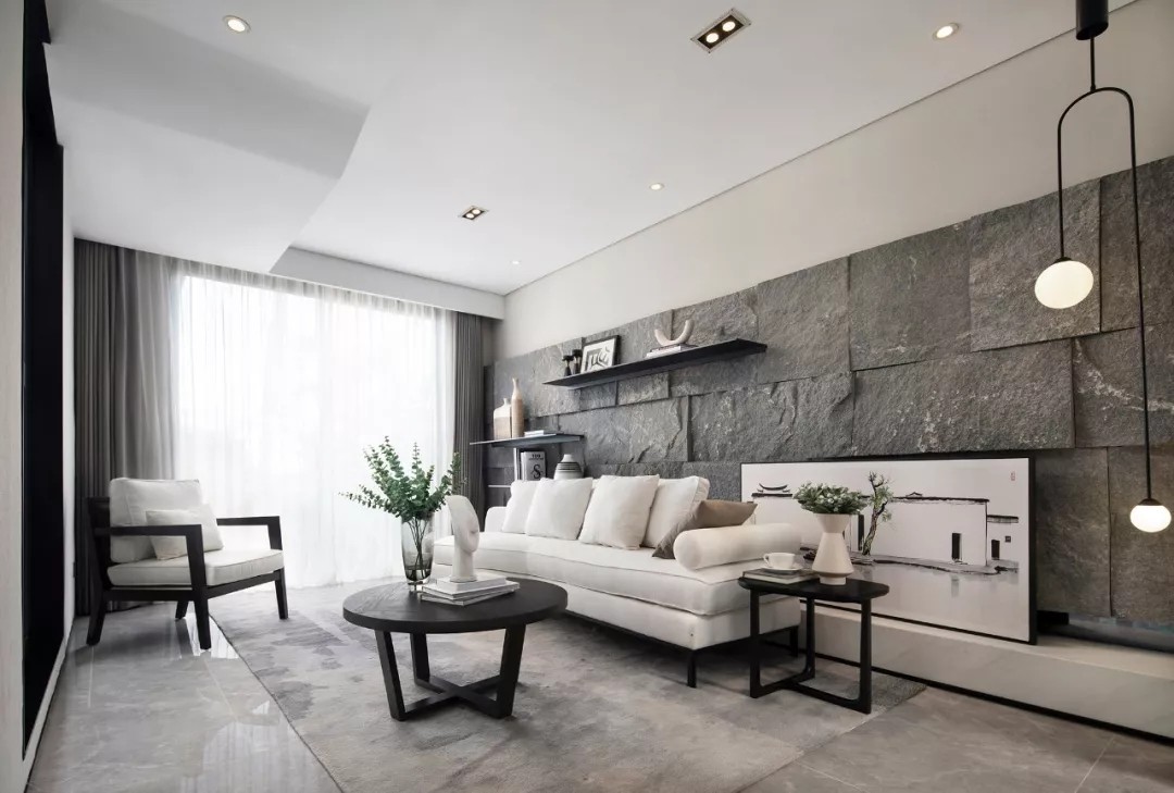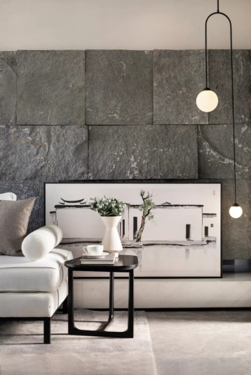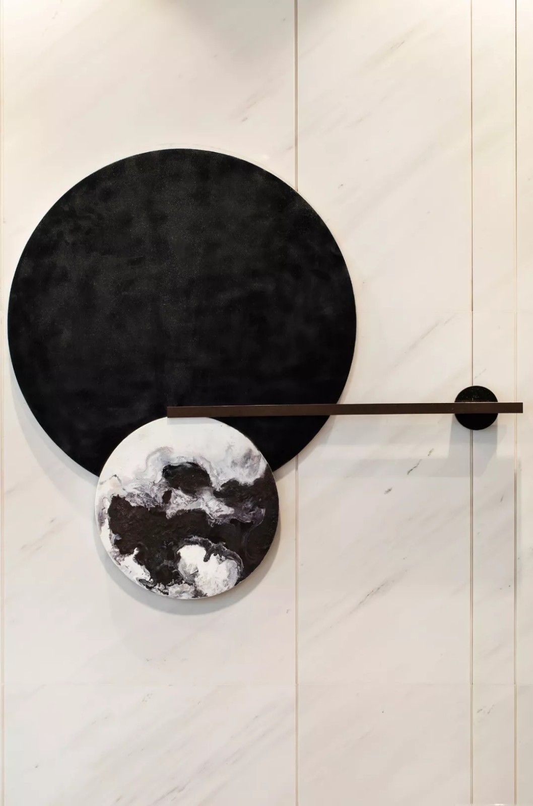 会客空间意在营造一个温馨舒缓的惬意氛围,茶几与沙发组合以黑白色调为基准,简单纯粹,与水墨意境的抽象画设色一致而素雅。在形态塑造上,设计运用了一种全新的模式,背景墙在壁纸硬包的基础上,增添了三分之二的毛面石材,将自然的粗犷与生活的温柔巧妙地融合为一体,实现了绝妙的无缝对接。空间之中既有分明的棱角,又有柔和的弧线,在光与影、虚与实的映照下,层次与线条交织出新的诗意。