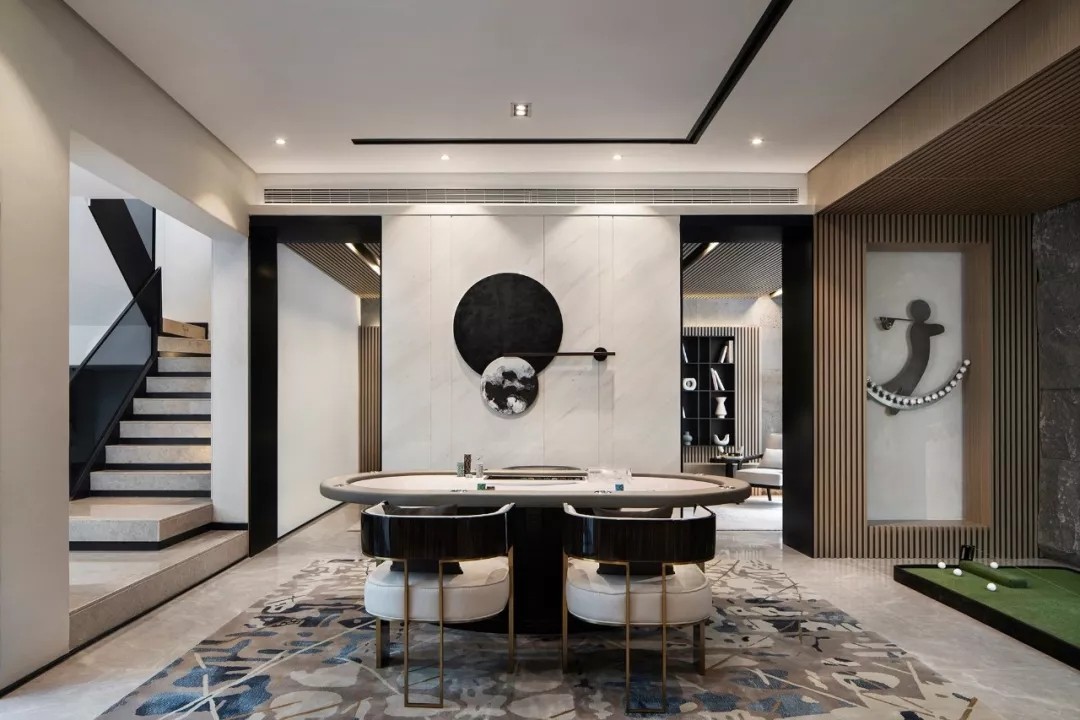 艺术,源于生活的每一个瞬间,是爱好,也是习惯。娱乐空间匹配居者生活情调,既注重功能使用性,又强调艺术品味。香榭蒂一贯以设计描摹艺术人居的诗意万象,在这个区域,设计删繁就简,木艺格栅的铺陈运用,为人居空间注入如诗般灵动清沛的气息,借助灯光布局,从室内自然过渡到采光庭院,纳入天光树影的诗意情境。