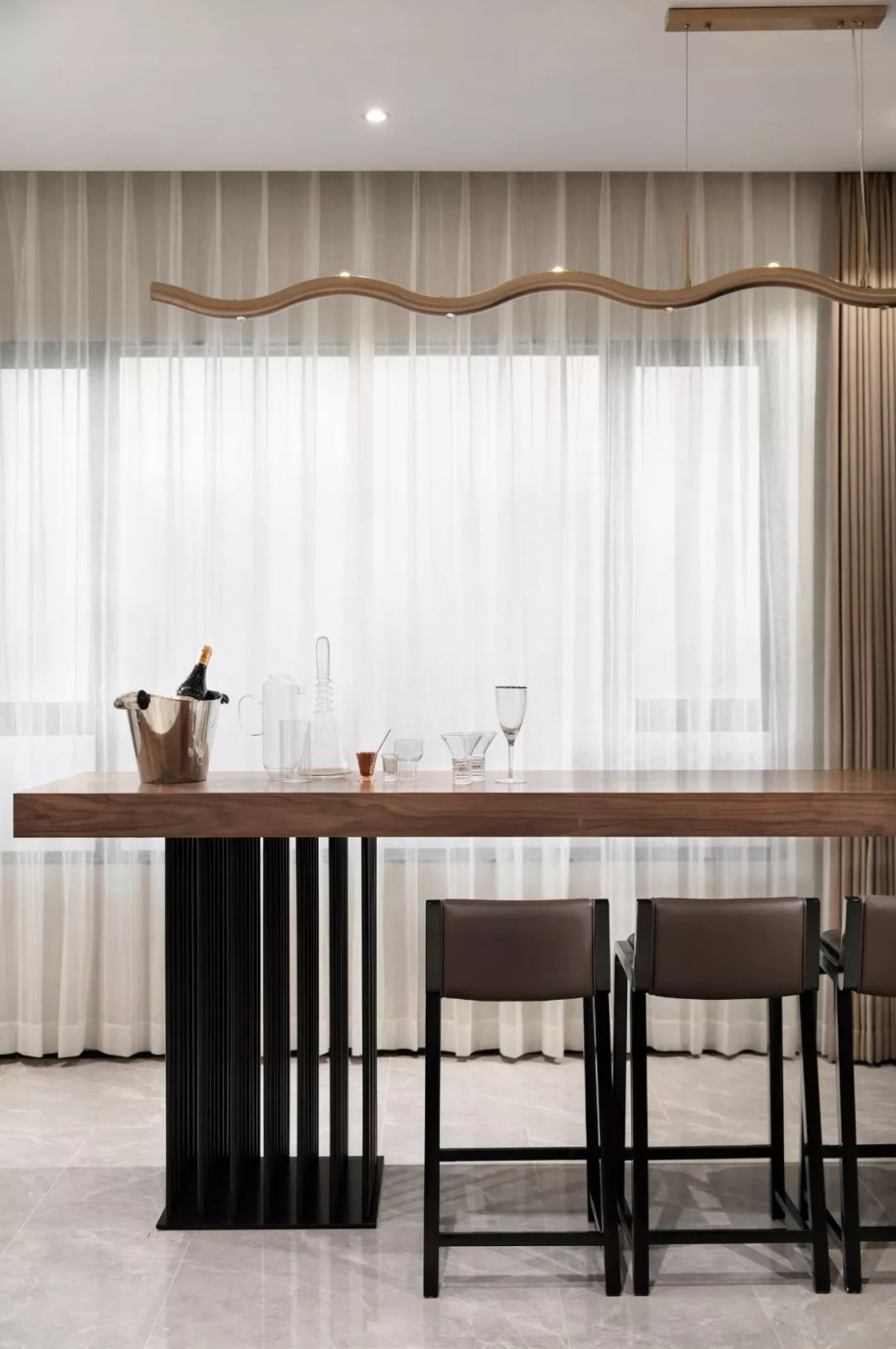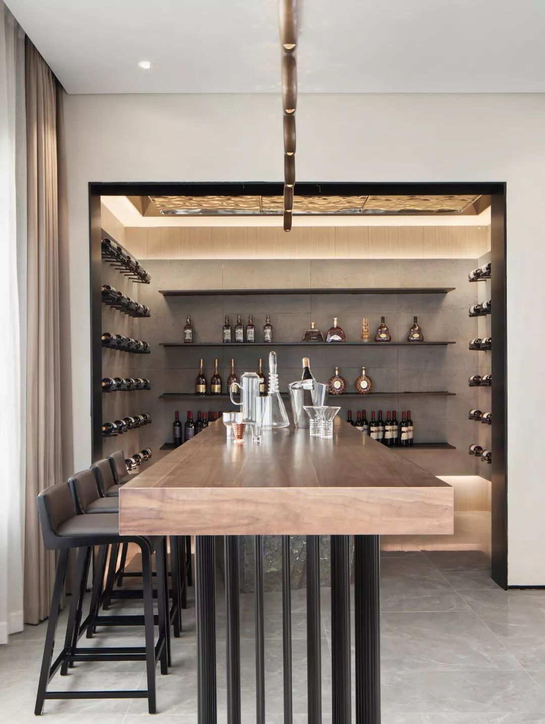 空间设计简单界分内嵌式藏酒区与开放式品酒台,把握纵深的视觉感,顶部悬挂着色调一致的波纹型吊灯,营造酒吧的氛围,是举办家庭小型红酒宴会的绝佳场域。通透玻璃、木艺质感、红酒色泽......细节装点是生花的妙笔,将明净的现代气息与静宁的美学气质烘托尽出。在幽暗的灯光下,三五好友浅斟对酌,品味生活的微涩与甘甜,畅谈人生、梦想、艺术与自我,成就空间整体情境的诗意化。
