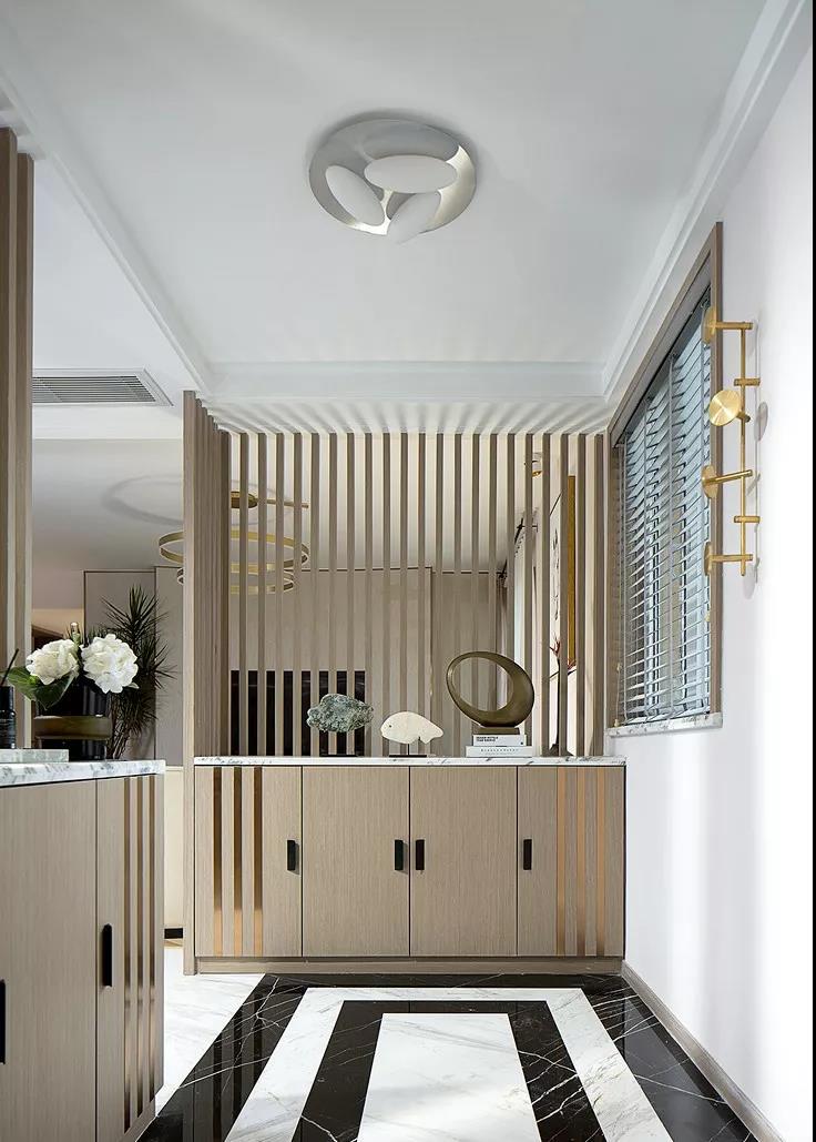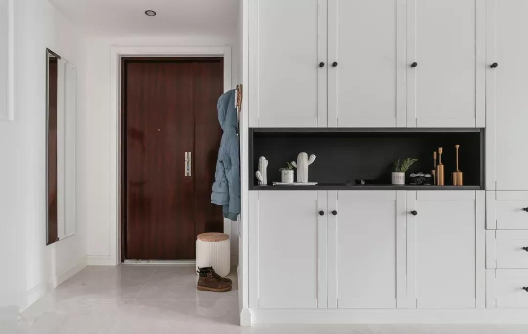比如,增大玄关的收纳储物功能,把端景柜、鞋柜、衣柜、换鞋凳、换衣镜等合理搭配布置,让玄关成为一个具收纳+装饰于一体的功能区。