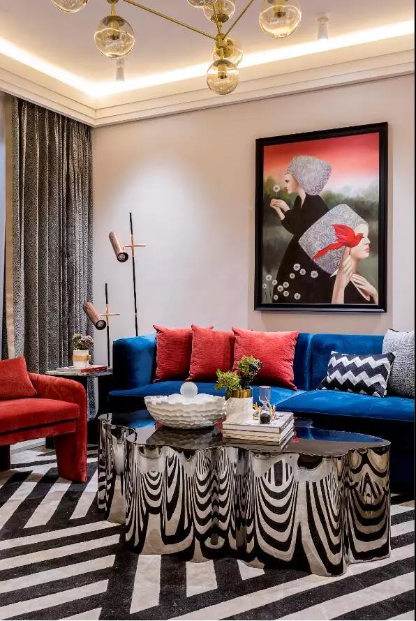浓烈的红蓝色系演绎客厅空间,通过编织、重构、组合等精心处理,进而为空间创造出更加细致入微的层次感。一处自在,而设计是恒久的,在经过很长一段时间仍然具有耐看的质感。以设计对待现代生活的需求为考量,为快节奏高强度之下普遍缺失趣味的现代人,演绎了一场打破固有的审美秩序的前卫体验感。具象的画作在这个奇妙的空间中,与不同的质地,形状和纹理和谐地融为一体。