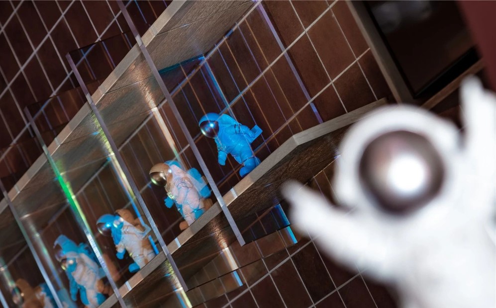 聪明的探索者,或许已经发现了设计师的“小心机”:光线。光线注定是这场星际旅途中不可或缺的灵魂:飞船的镭射光斑,让人眼前一亮;立体行星的光芒,则为宇宙的迷境增添了神秘感。光影摇曳之间,远处的白衣宇航员,破除了墙面单调沉闷之感,同时,也向一路走来却一直坚持探索的勇敢者致敬。