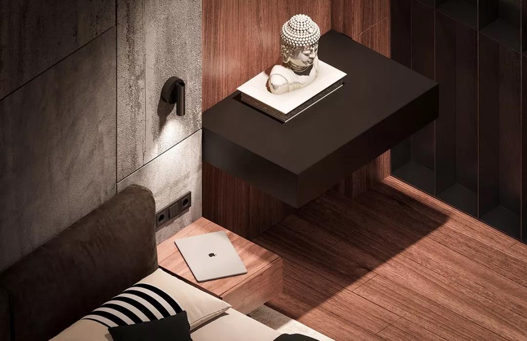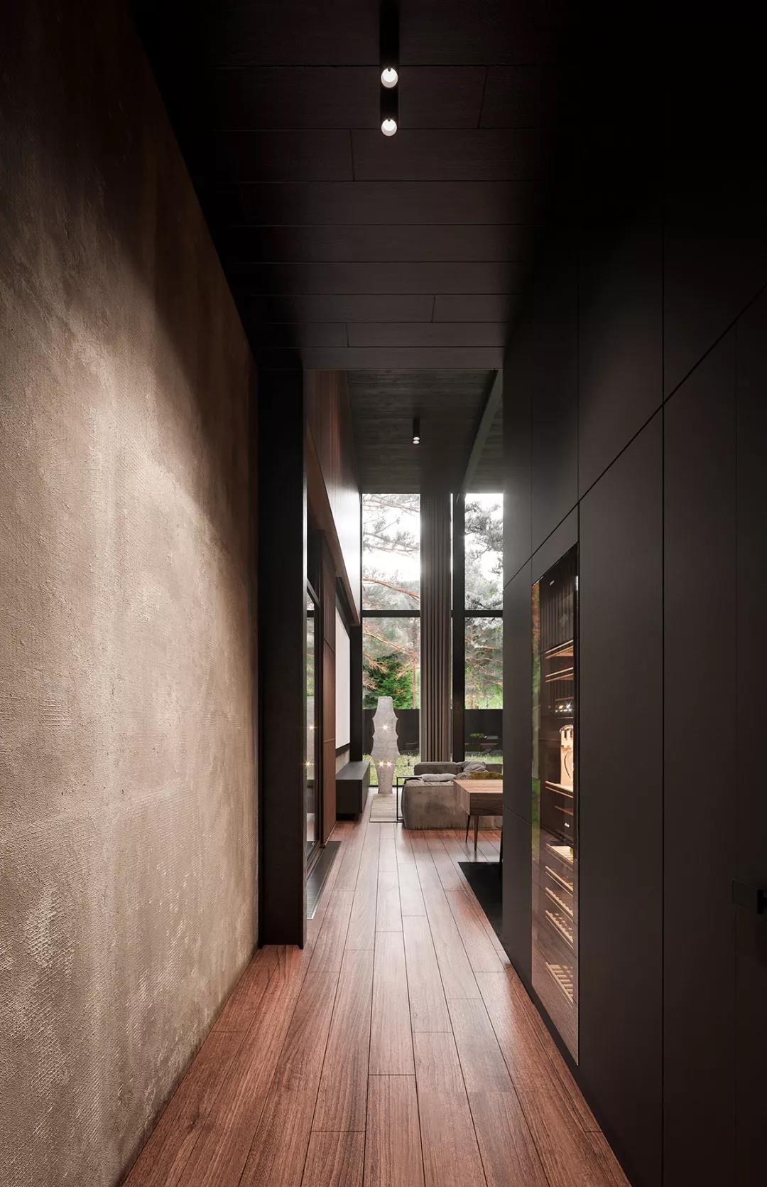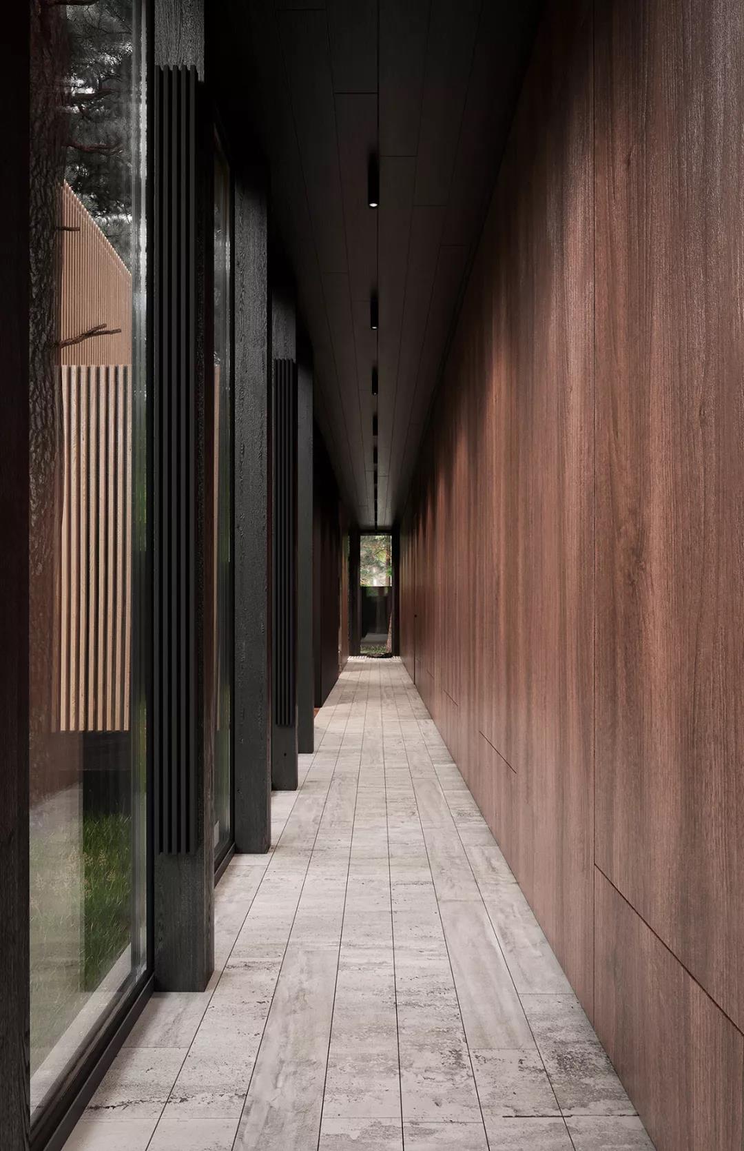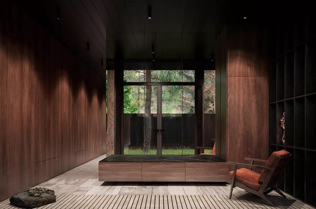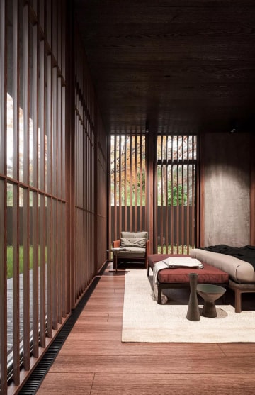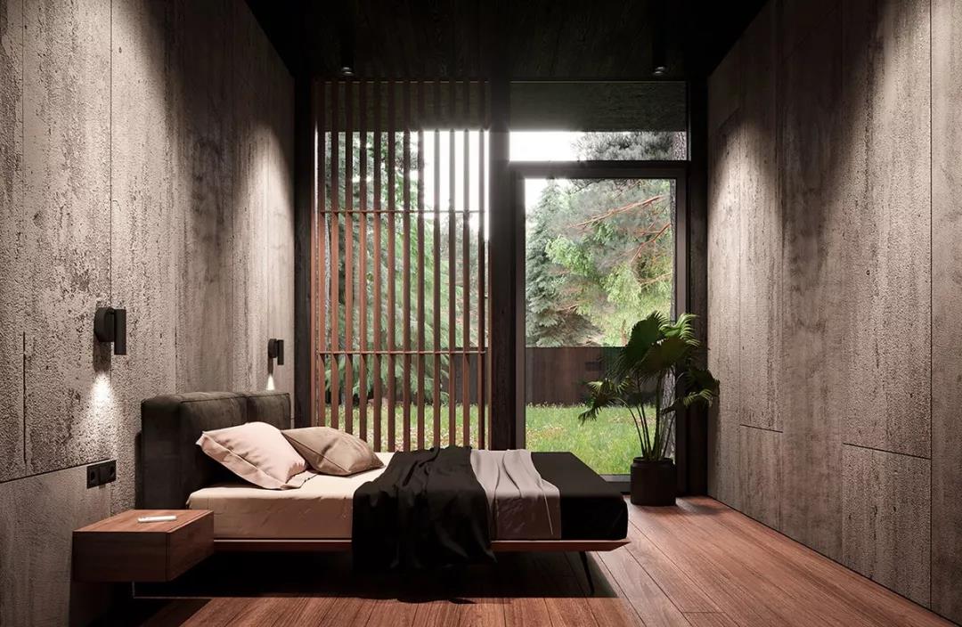 丰富木材气氛和纹理水泥灰,很豪华卧室装饰,在个现代墙壁烛台照耀下,整个空间很温馨,户外是一个花园,木条墙设计在前面的玻璃,板条拉伸整个高度的空间高度。