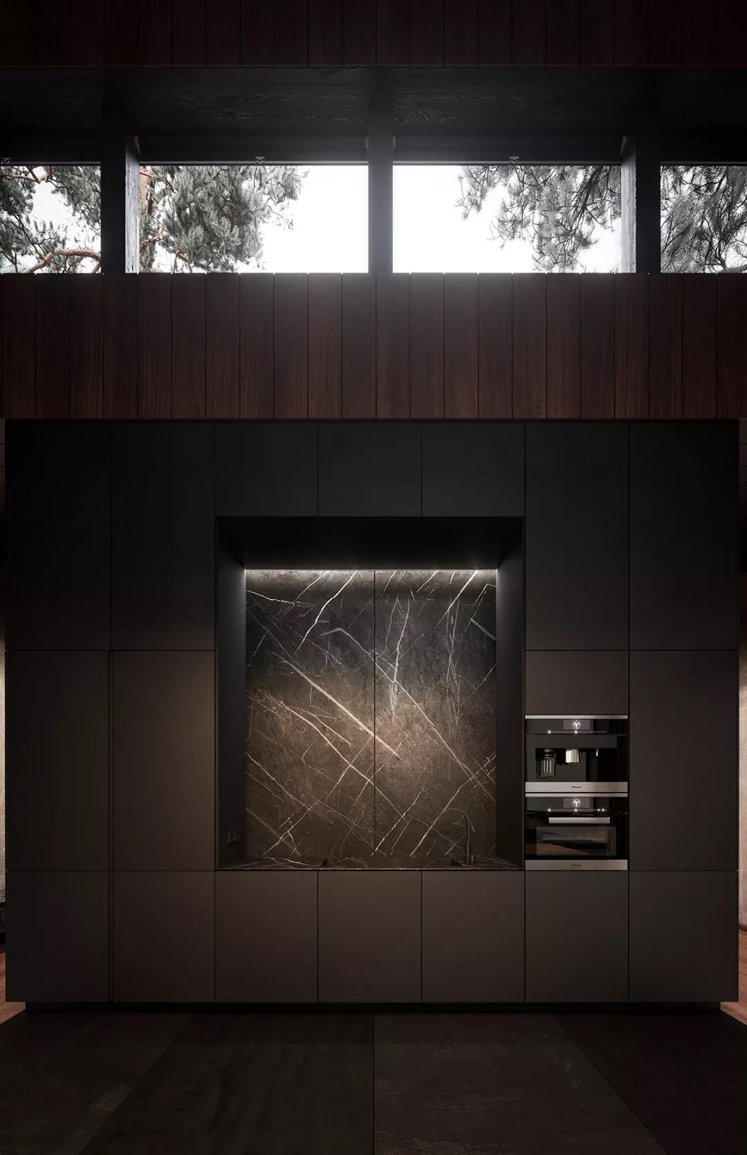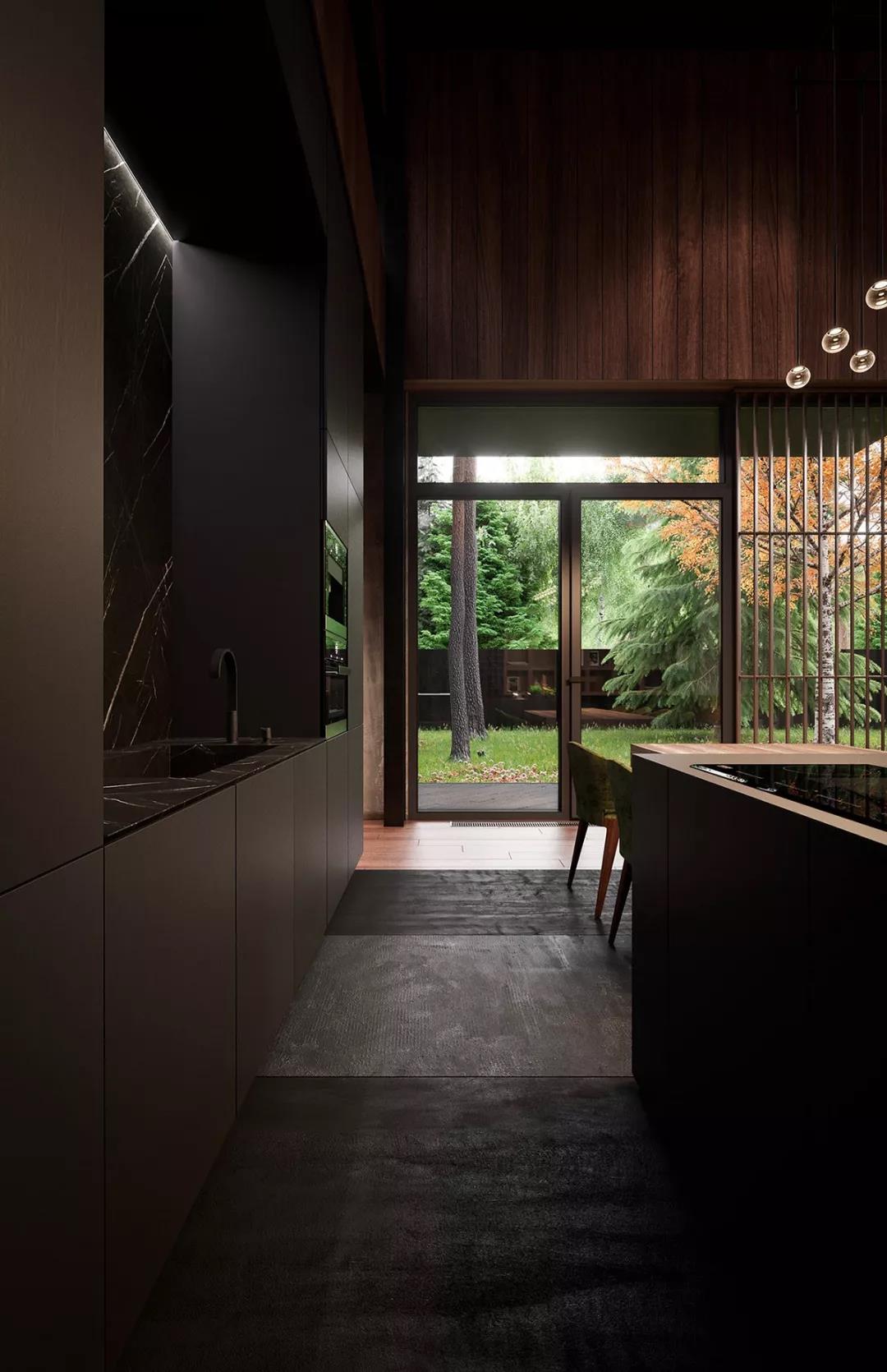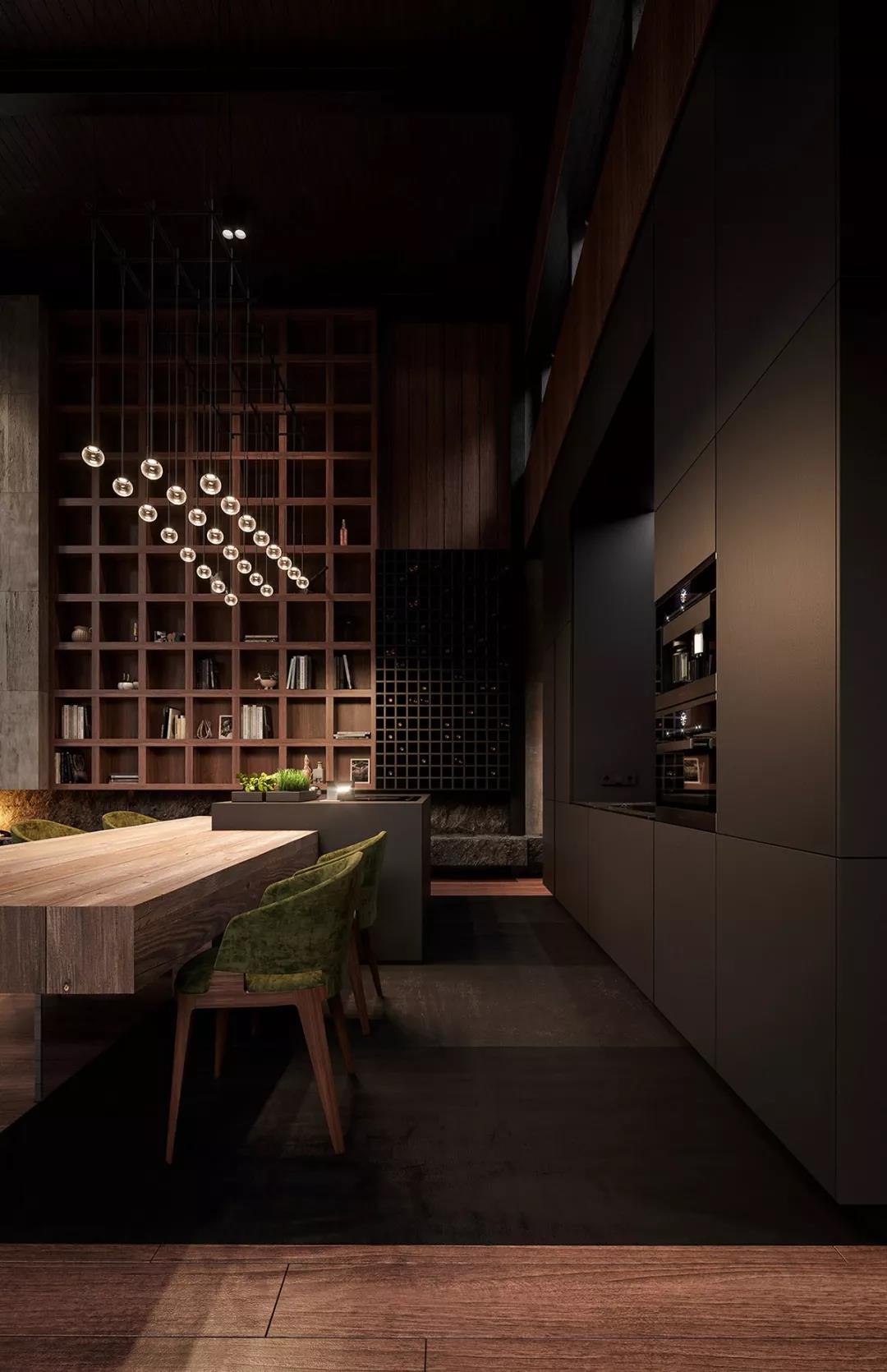 绿色的豪华餐厅椅子,厚实木板餐桌,干净明亮的现代风格厨房,开放式的布局设计,黑色的厨房岛台,结合黑色的厨房背景墙,多了几分沉稳。