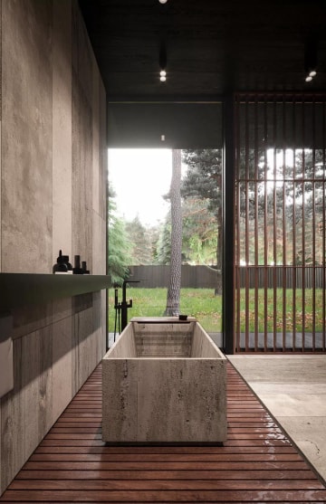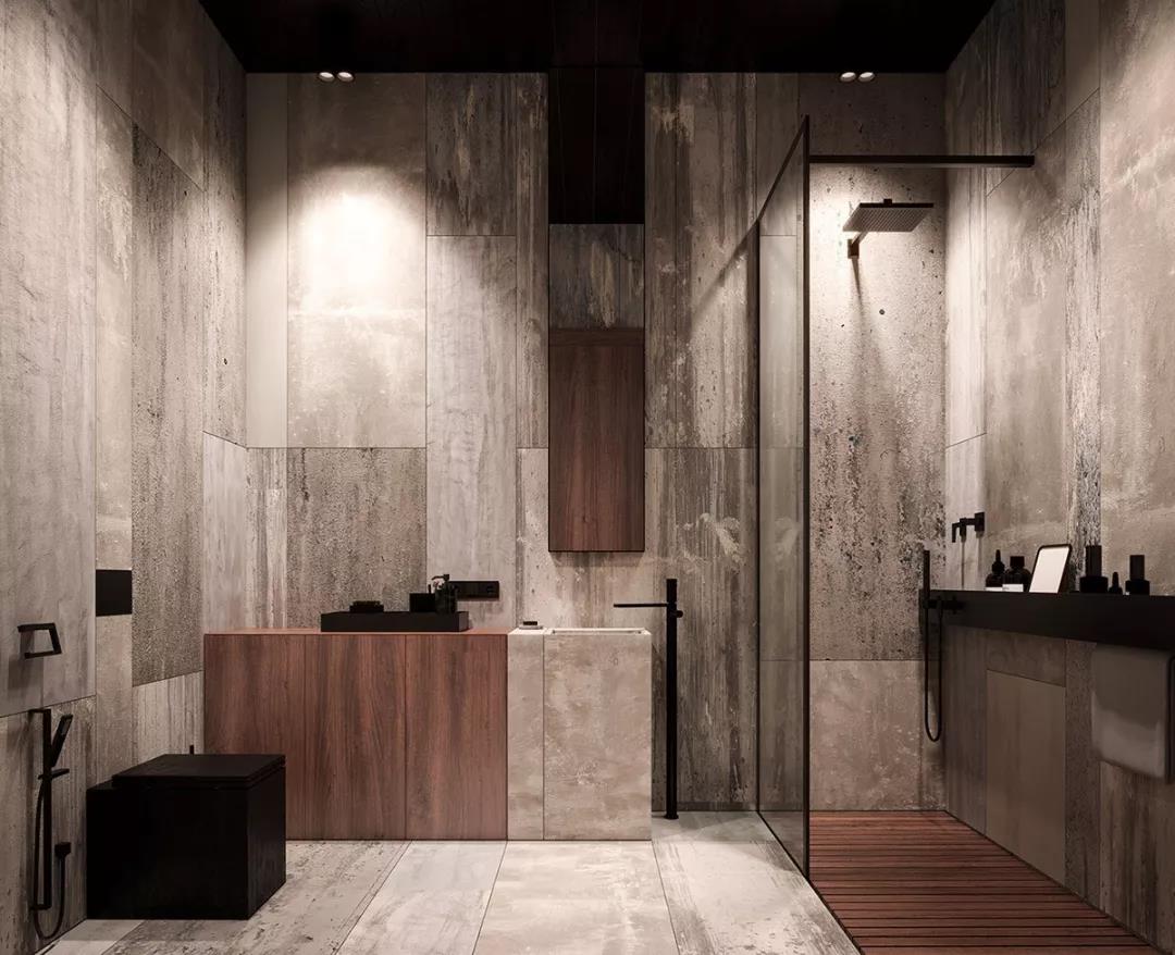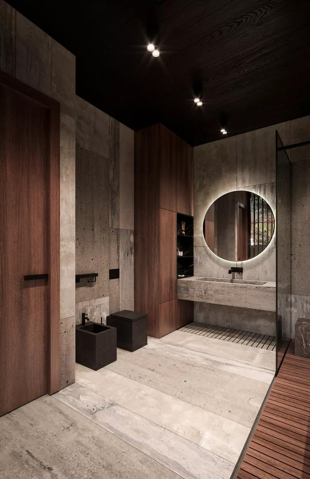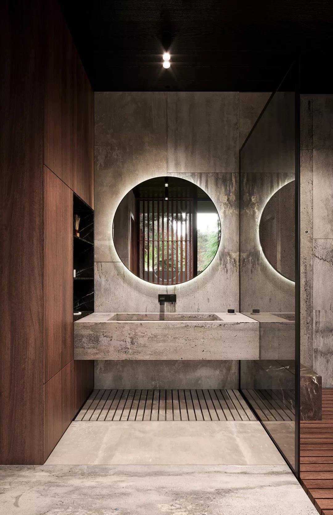 奢华的浴室,以水泥灰搭配木色,烘托出家具的色彩和质感,一个大型照明化妆镜亮,整个奢华大气,却又带给人一种返璞归真、回归自然的感觉。