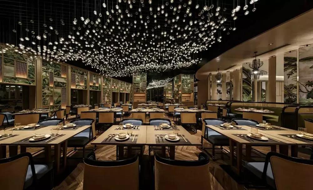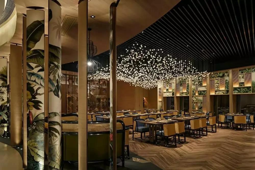璀璨的灯光洒落在舒适的藤椅和木饰面餐桌上,配上墙面装饰着大幅热带雨林植物墙画,宽敞五遮拦的用餐区域让宾客犹如置身于繁星下的热带小岛上用餐一般,抬头可见星空,感受与众不同的悠闲与惬意。