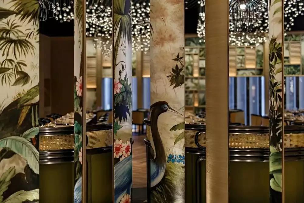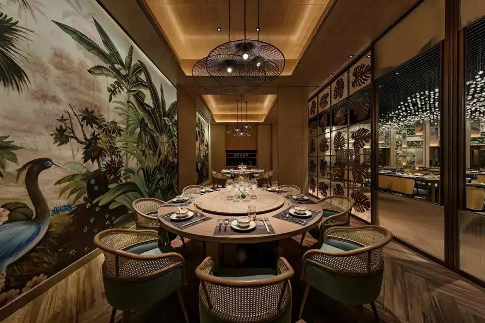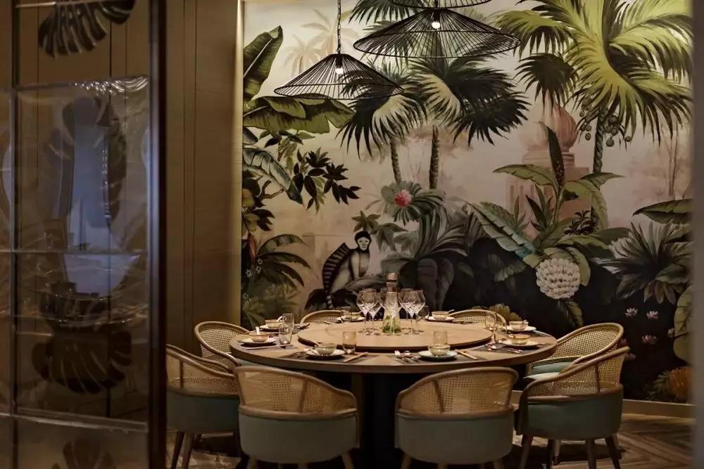 VIP 室与主用餐区以一扇镶有古铜芭蕉叶的移门相隔,既划分出安静的独立区域,又可隐约感受到外面的热闹氛围。墙面以丰富的热带雨林和动物呈现,为整个空间带来活力和灵动感。灯饰的竹篮或是芭蕉叶造型,简单又时尚的为空间起到点睛之笔的作用。