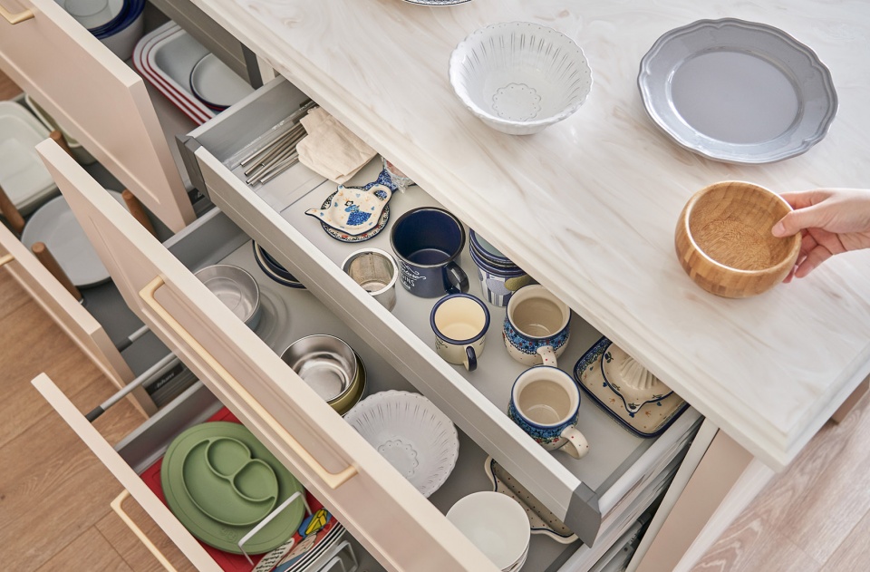 ▼餐厅,对内单向抽屉能迅速清空桌面应付办公及用餐需求