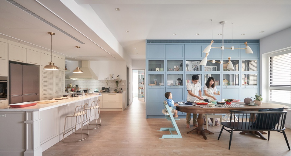 因在屋里活动时间长,重视亲子关系培养,故决定拿掉多余隔间,将重点放在公共空间的整体功能规划。甫入门可见客厅、游戏区、书桌兼用餐区、开放式厨房集结为一,利用家具将各区块功能性划分出来,不论是在中岛备料、大桌上办公,面向游戏区便于随时追踪孩子动态、对话。而视觉上的穿透性可能造成的杂乱无章则仰赖为女主人量身打造、丝毫不差的收纳柜体解决,使空间在视线上能够保持一致地俐落。