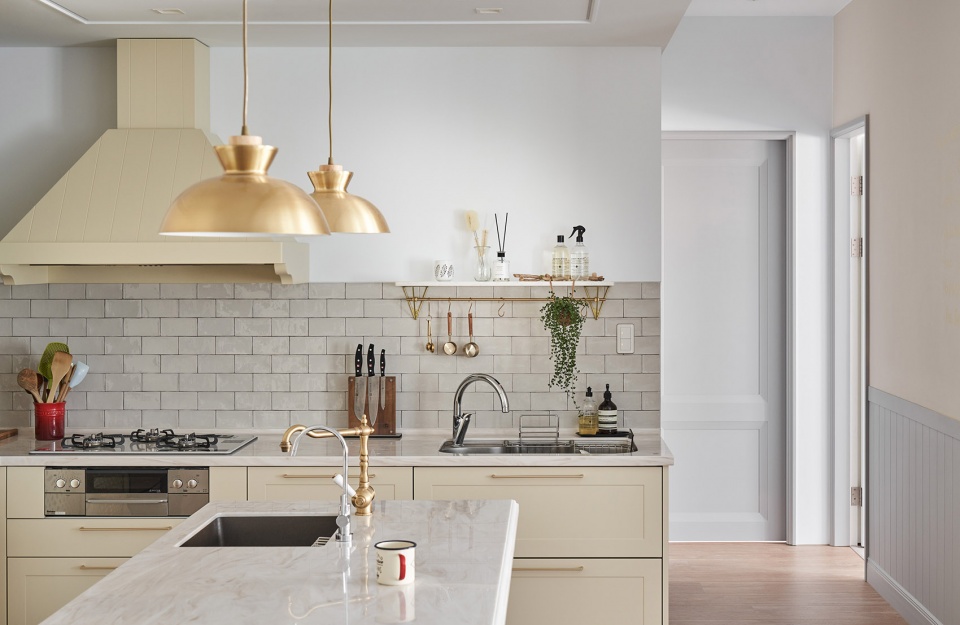 主要材料:意大利复古花砖、特殊土质涂料、实木染白、滑梯桦木夹板染色、 杏色实木烤漆厨柜、杜邦仿石纹人造石、MASTER超耐磨木地板