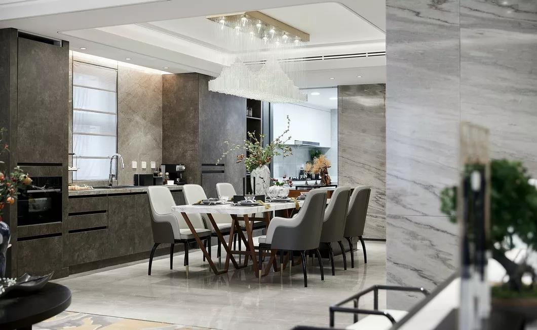 餐厅正空悬挂着琉璃灯具,似梦似幻的山川造型挥洒在餐桌。——END——本文转自拓者设计吧如有侵权联系客服