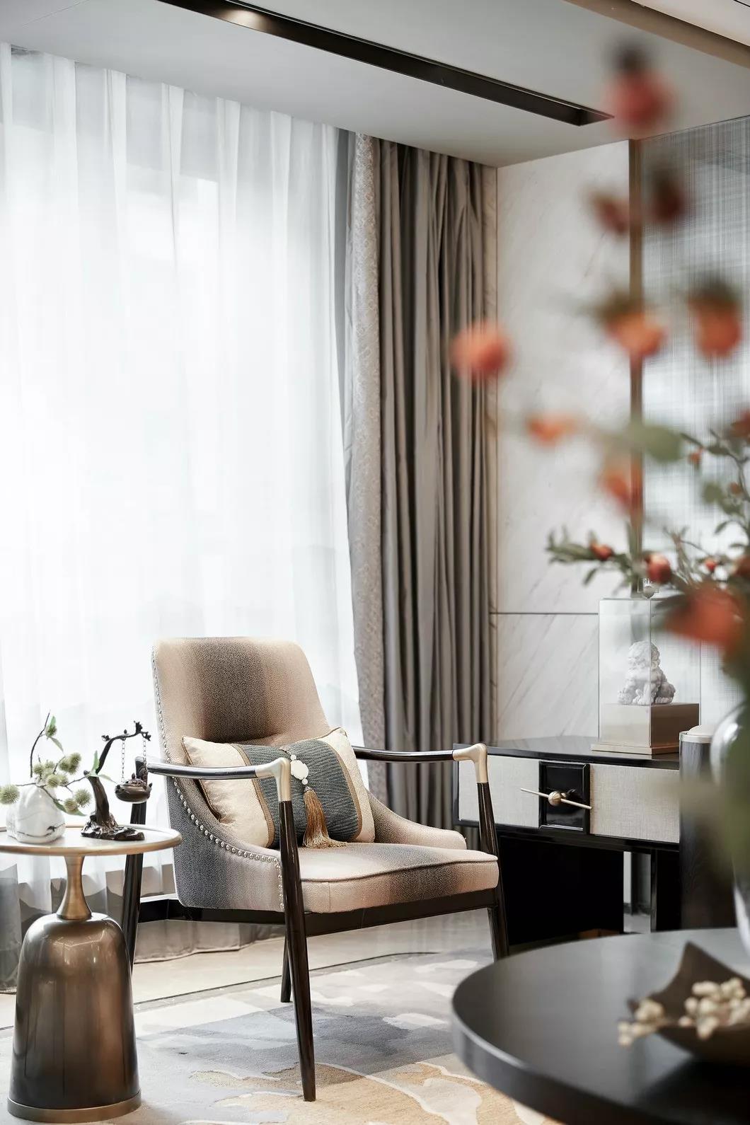 主卧空间沿用的色调与整个空间相互呼应,精致中带有内涵。每个饰品都展现出房主沉稳的中式情节,每个细节都恰到好处。