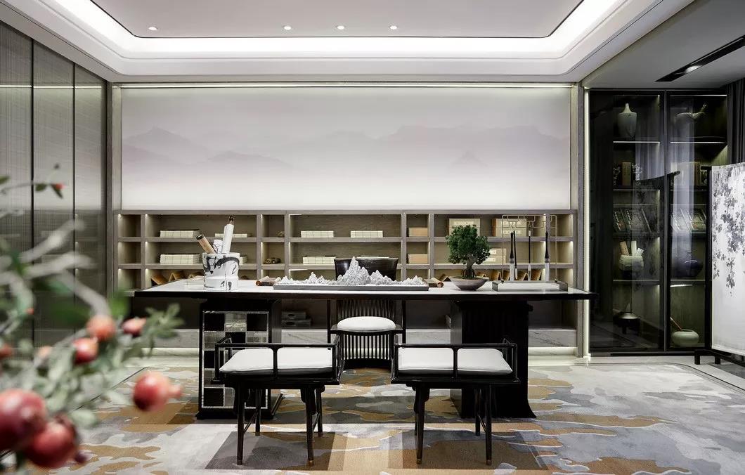 书房的背景缥缈中可见山川,与餐厅意境相互呼应,一虚,一实,似挥毫泼墨,颇有文人墨客的风骚气质,虚实相映间,尽显中国古韵。