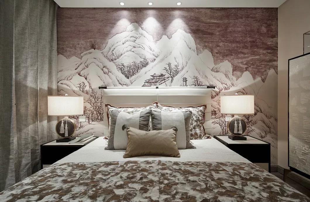 老人房依然延续了端庄沉稳的东方气质,为长辈创造一个舒适和全然放松的空间。山水元素融入在手绘背景墙和床品等细节里,将和谐的寓意带入居住空间,为生活造景,人类与自然于此交融。
