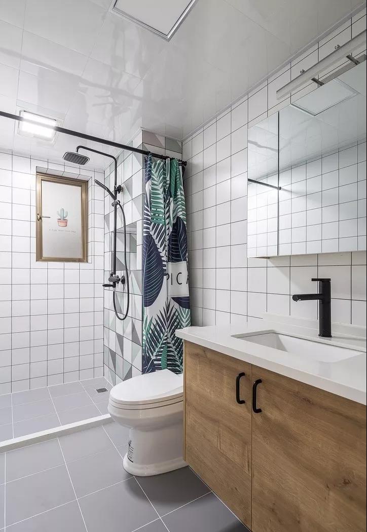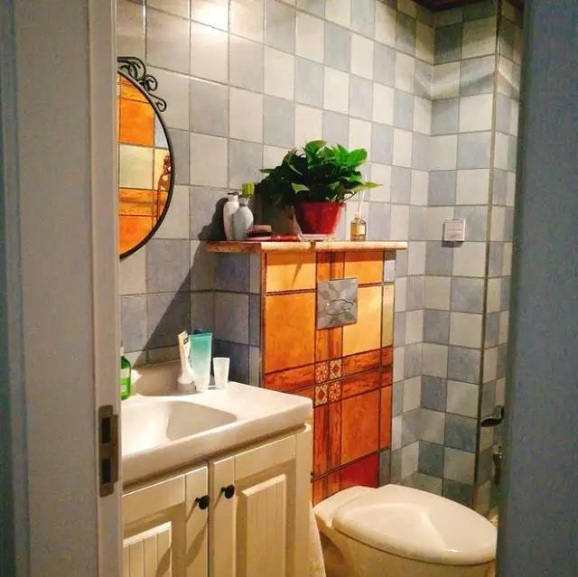 色彩搭配上也不宜过多,小空间颜色多会显乱,浅色墙面深色地面的正常搭配就足够了,想要来点新意,马桶或洗手台区域用花砖点缀,这样的卫生间就足够好看了。