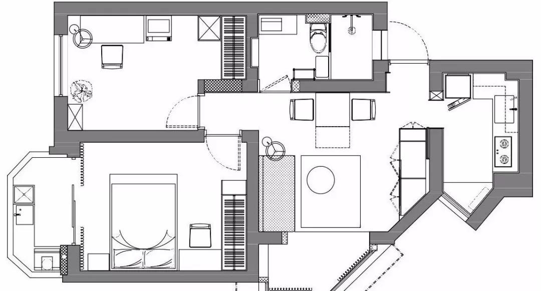 ▲ 客厅,水泥自流坪加铺大张黑白几何地毯,用轨道灯和灯带来代替主灯设计