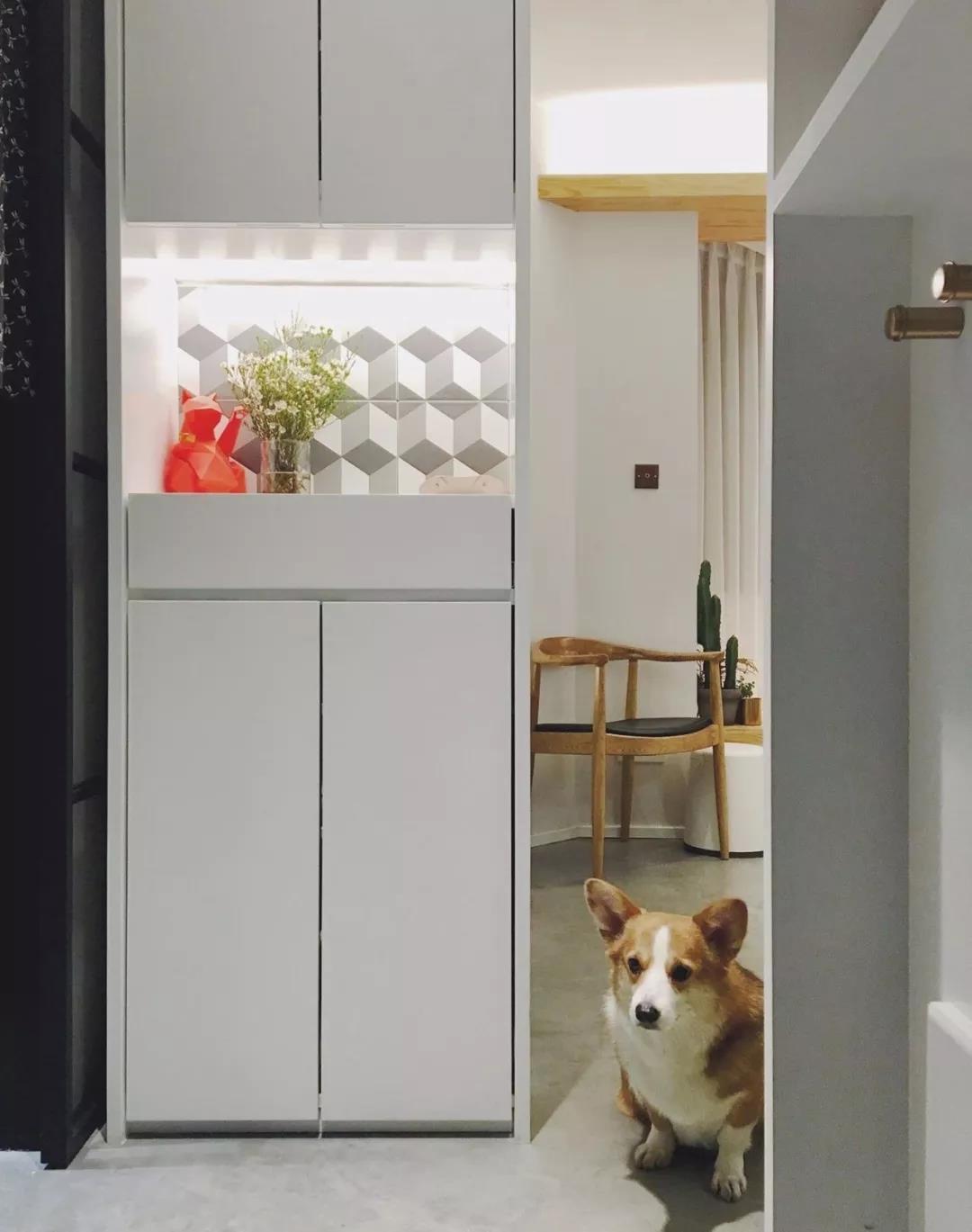 ▲ 玄关,鞋柜设置在电视柜的侧面,与厨房的墙拓开一点距离,让厨房的移门可以隐藏收进柜内