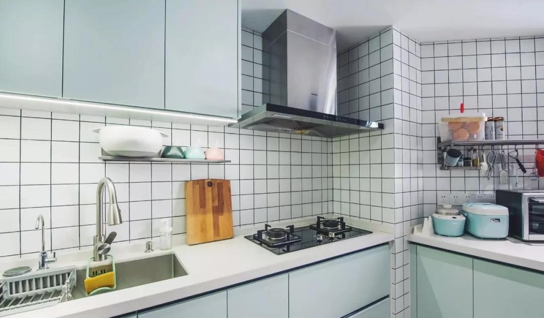 ▲ 厨房墙面铺贴ins风小方砖,清新调橱柜底部嵌入光源,方便台面操作