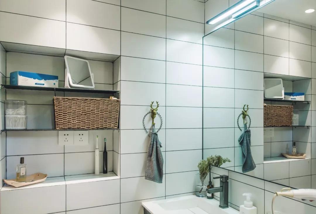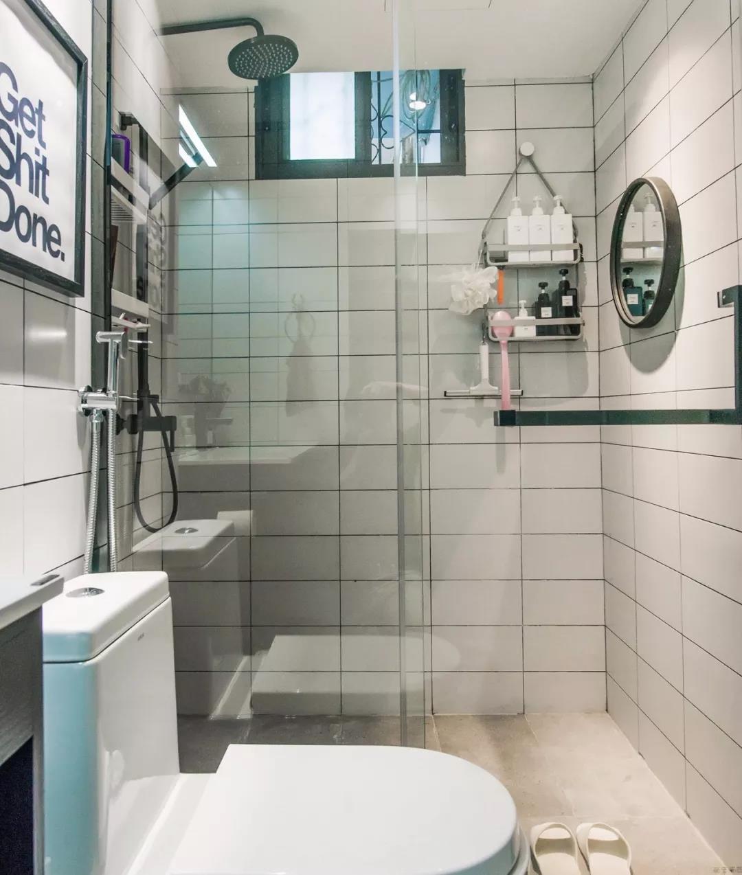 ▲ 用玻璃移门作淋浴隔断,墙面设置双层挂篮与圆镜,将热水器隐藏在吊顶内