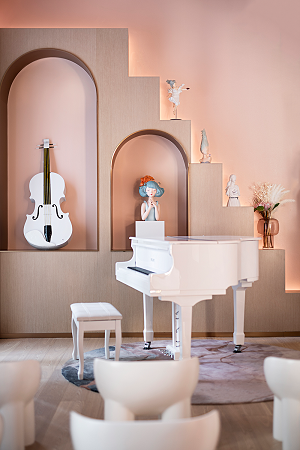 音乐教室以弧形小拱门为背景,搭配趣味十足的阶梯艺术摆件,减轻了传统意义上的教室压迫感。如同穿过“海底隧道”后的一片不为人知的秘密小基地,令孩子们流连忘返。