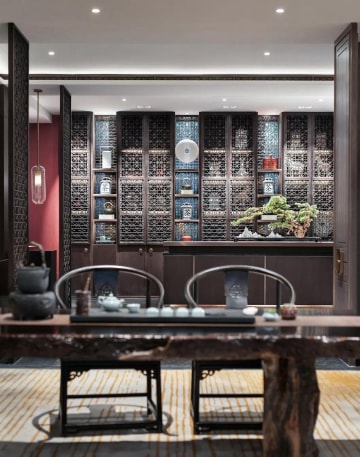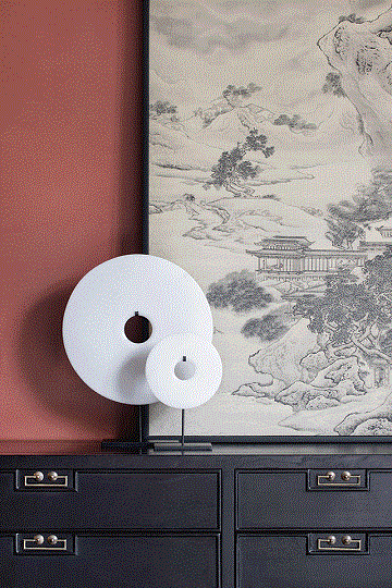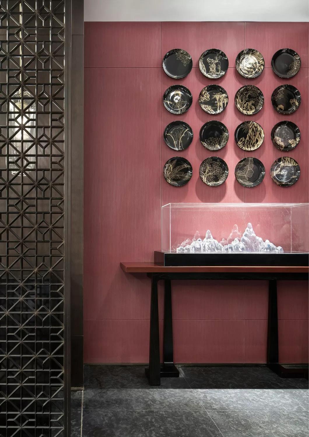 中式正统的墨调与朱红,在空间中点染映缀,与岩石灰、黛蓝、深烟红、玳瑁、素白,共同凝练出臻于画意的境界,呼应着山水画作的诗意绵邈,在有限的空间中营造出无限的东方意韵。