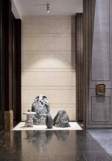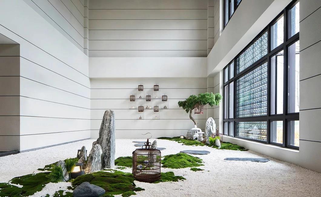 沿着阶梯到了二层,设计在样板房外构设了一处枯山水的悠然意景,以砂石写意流水,山石代作山峰,幽幽绿意、疏影横斜中,涵容着古雅的人文情怀。