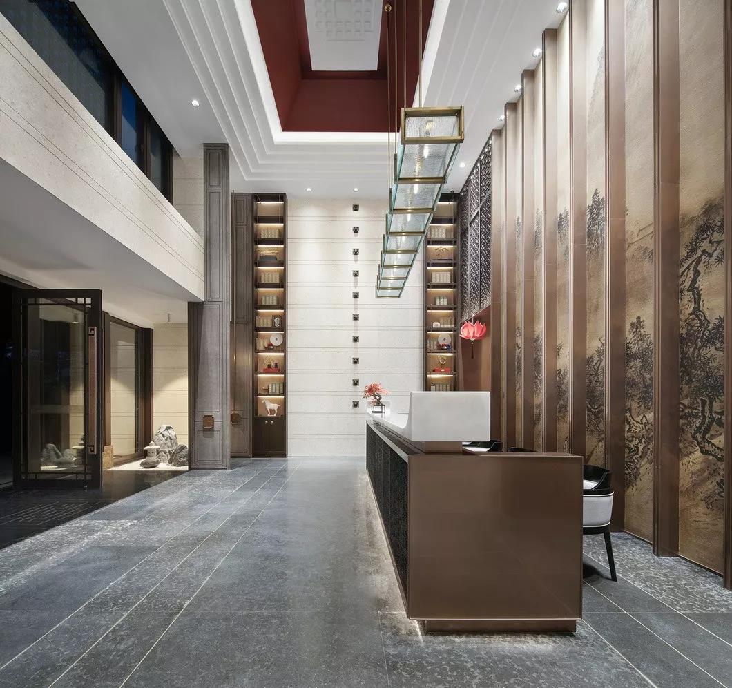 空间游弋于方圆之间,规整端庄与圆融柔雅糅合;两侧大型的立框,以现代的手法借景山川云松之灵秀峻美,水波纹理石加以呼应点缀,空间升华出广阔无垠的意境感。