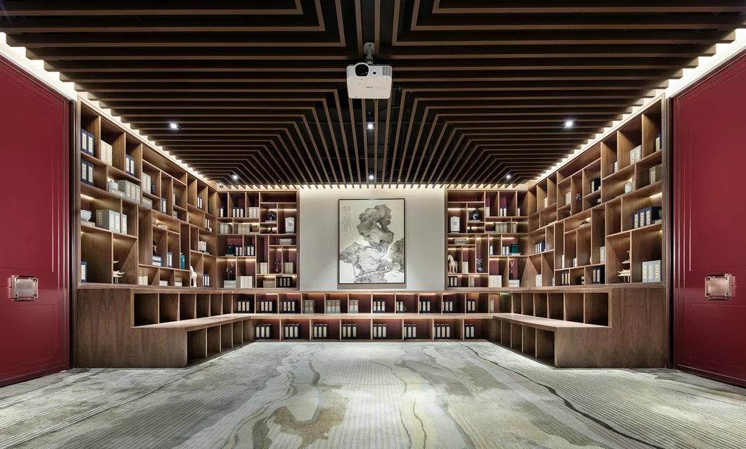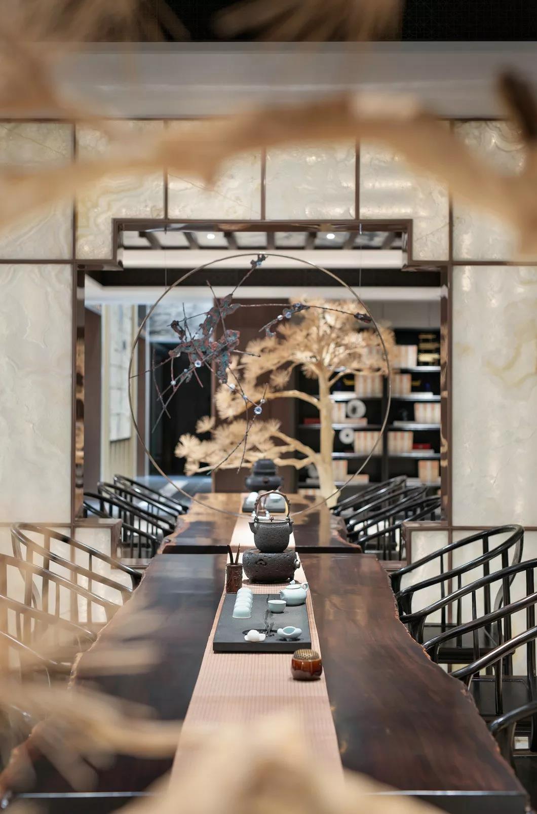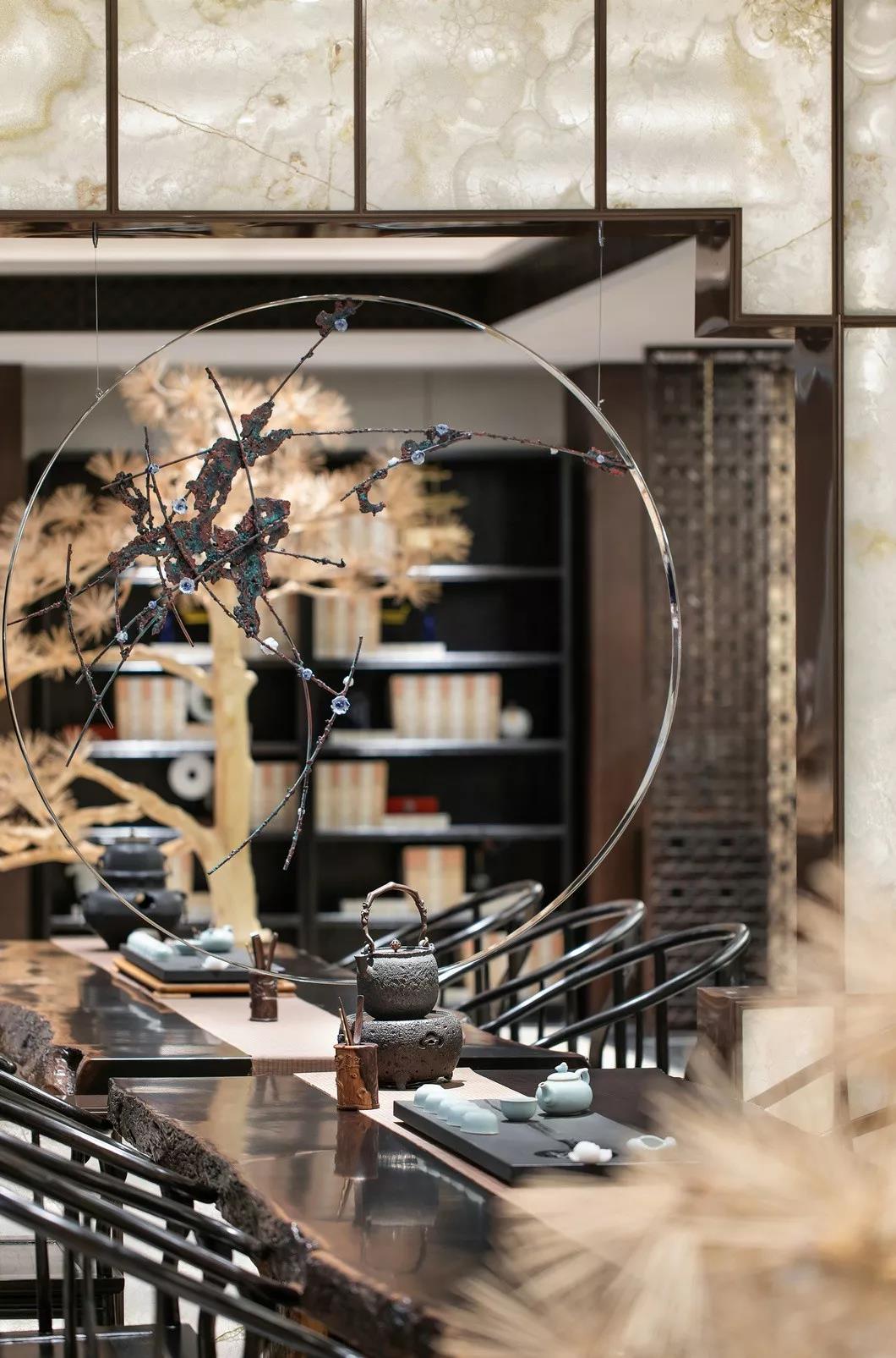 接待区承袭中式府邸的传统对称性布局,呈现俨然大气的视效。巨幅山水画在暖光下透着幽幽古意,用寥寥笔墨将自然与历史书画。