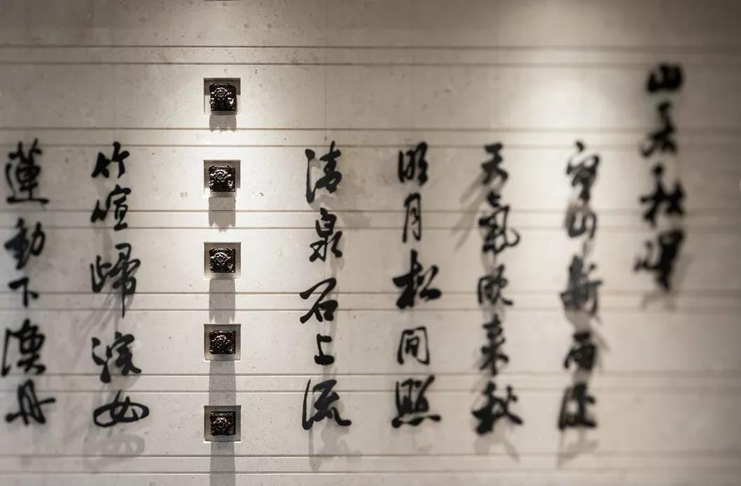 刻着五龙戏珠的木雕摆放在空间正中,展现闽地传统雕刻艺术的精湛工艺。象牙白色理石墙面上,设计以中国传统建筑艺术的门当元素及书法艺术构图设景,吟诵一首《山居秋暝》,空间中凝聚着浓郁的神韵气质,诗意绵绵,乐趣陶陶。