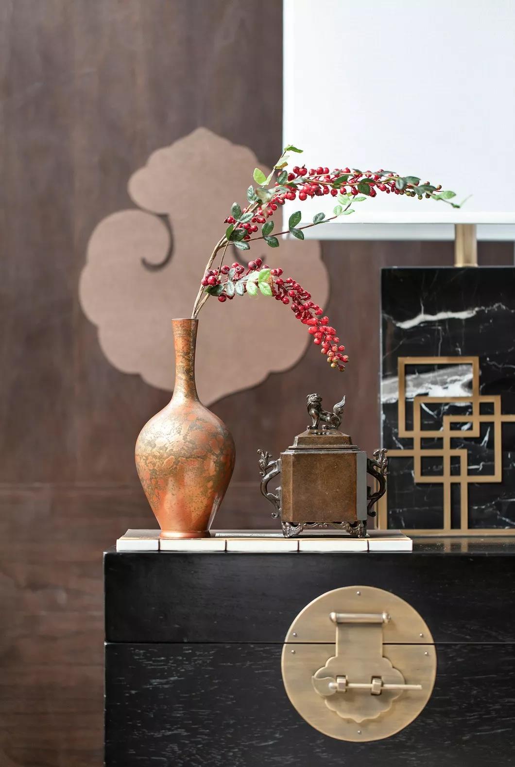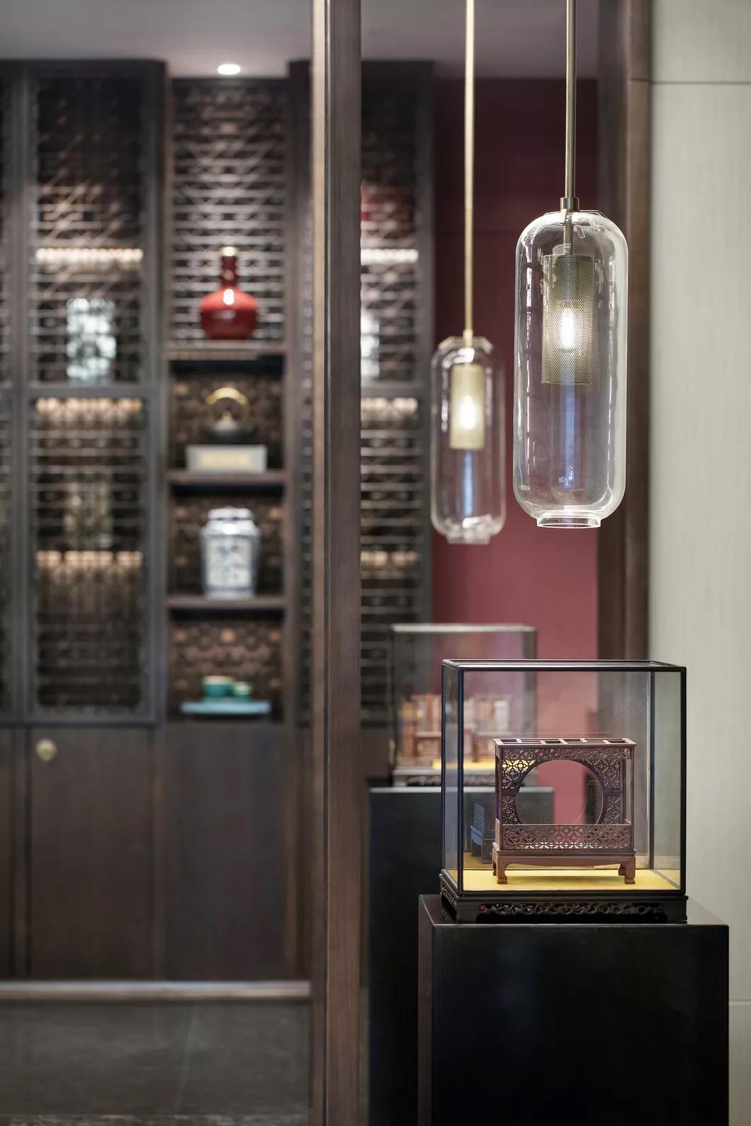 典雅的棕调与正统的朱红,糅合淡雅的杏黄与缟白,瓷具、锁件、缨佩、祥云纹等中式元素聊以助意,空间融于一片温润古韵之中。