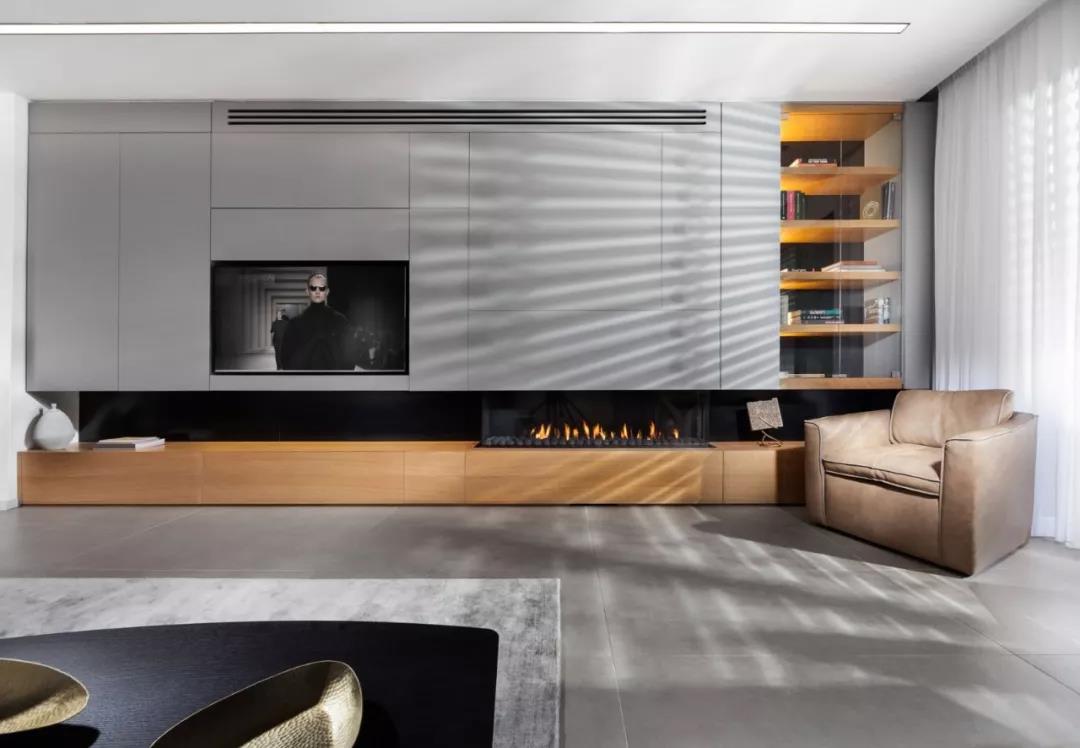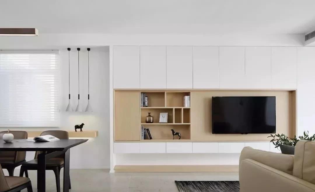 与传统意义的电视墙有较大区别,只是为了空间的延续,设计了电视墙,以往的电视墙讲究造型,好看,而现在,电视墙更简洁,低调,侧重实用与收纳。