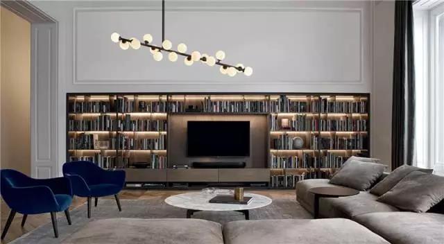 书柜墙周边设计也要够尺度够气派,长体量的电视柜、顶天立地的门和窗,无不彰显着客厅的大气豪迈!