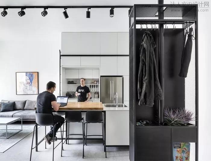 设计师巧用黑框隔断打破墙面单调感,同时使得厨房与客厅互动更方便,空间瞬间灵动了许多。
