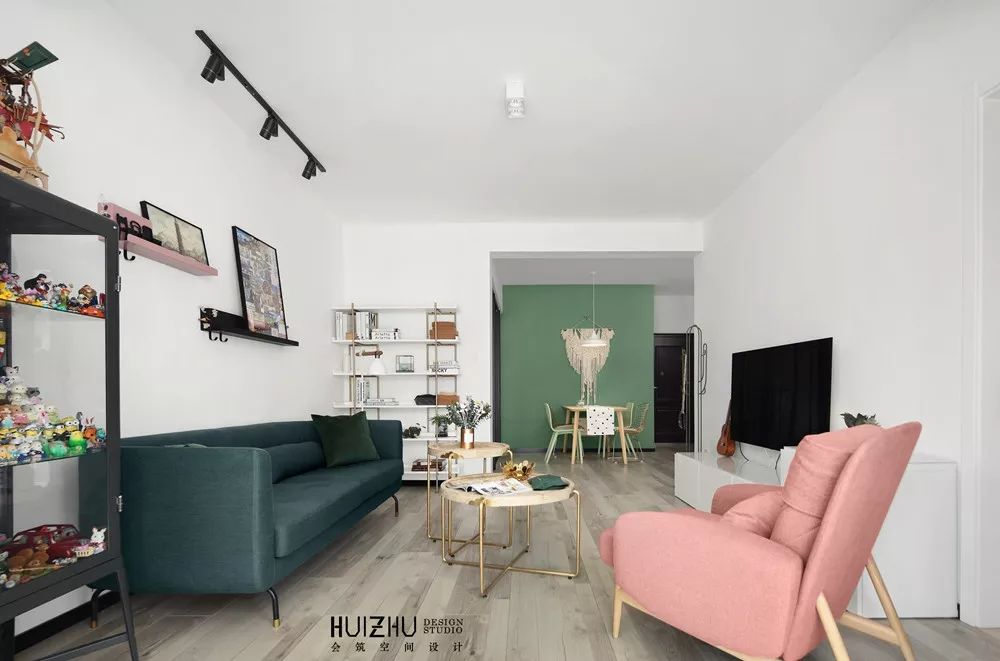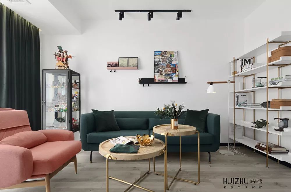 客厅沙发选择了两种色调相反的颜色,明暗交替,更多样化。中间的小桌子是金属+原木的经典材质搭配。角落里的展示厨摆满了主人心爱的手办。这些小细节都烙上了个人印记,使得这个家变得独一无二。
