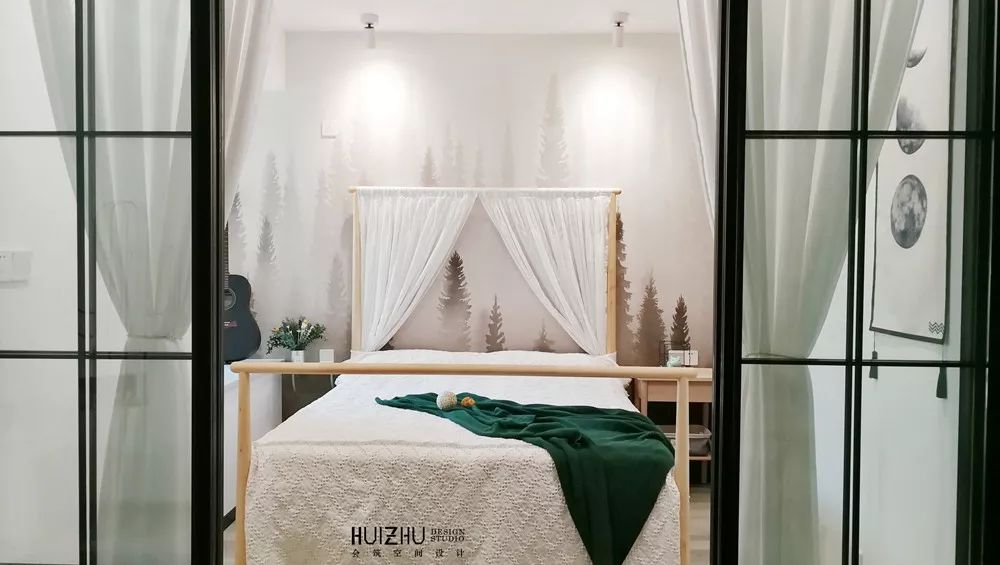 硬派的黑色金属边框的推拉门,与之相对的是棉麻材质的门帘,迷雾森林壁纸,刚柔并济,产生自由和谐的森系美感。
