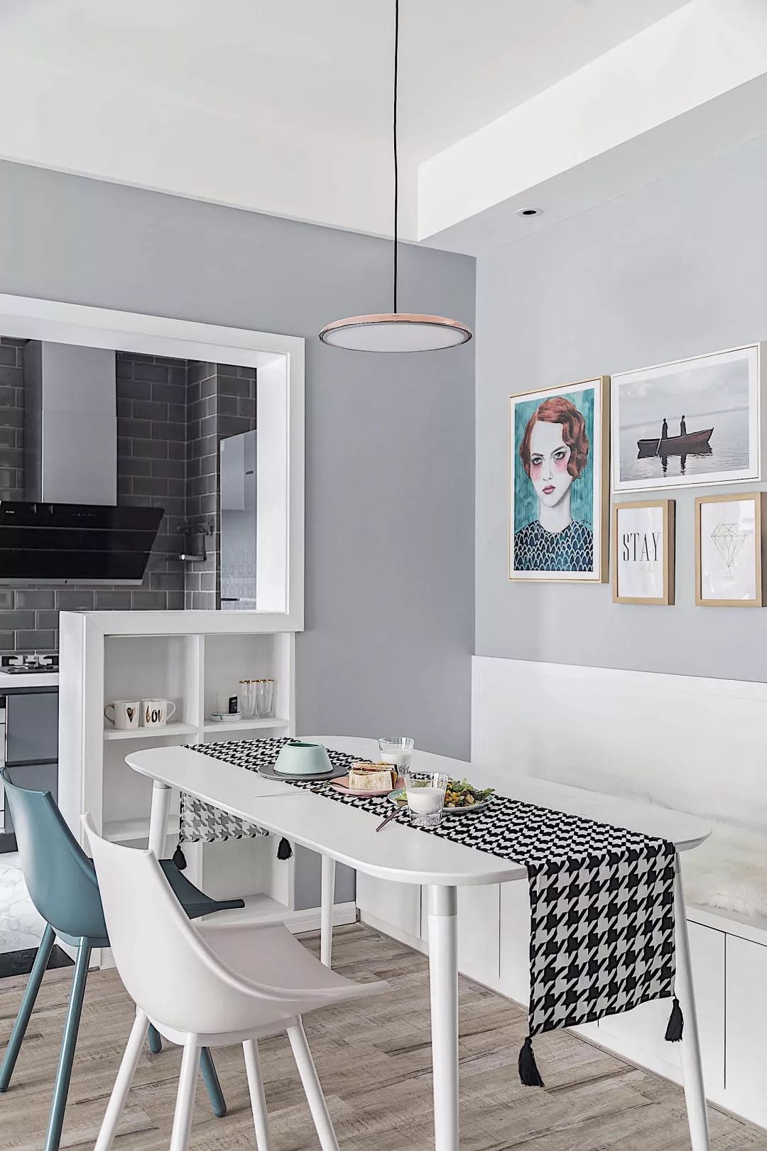 悬于一根细线的吊灯,墙上的壁画,以及与洁白桌面大相径庭的黑白桌布,这些细节之处既体现了主人的审美情趣又保证了色彩的多元化。