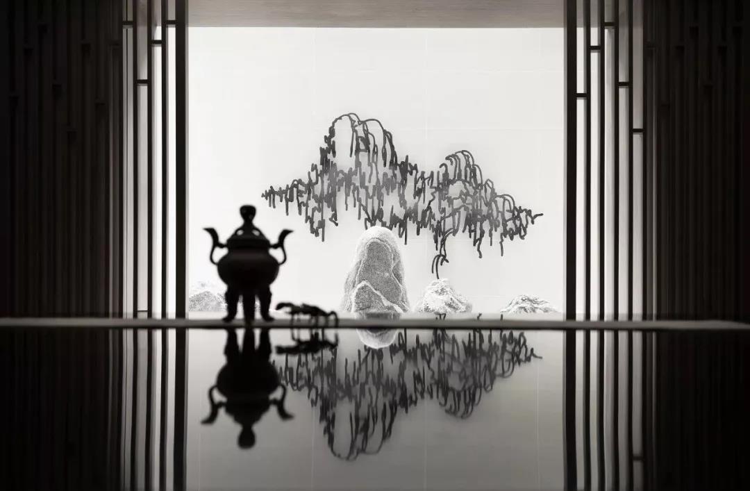 白砂翠竹,亭亭荷叶,水墨山川,空间的色彩与纹理映射着诗意万象。场所的内与外,虚与实,灵与雅,设计师用如云绵延、如水清幽的诗性塑造,将城市的喧闹嘈杂在清雅的场景中“自然化”,在诗意日常中消散成云烟。