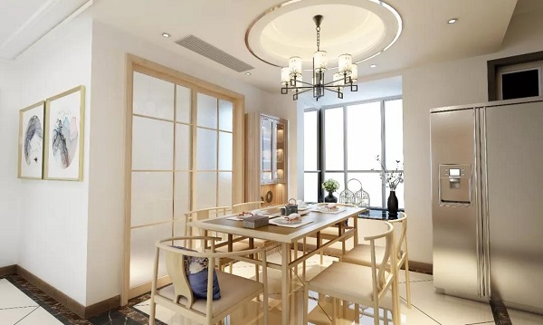 原木色的中式桌椅,金属边的圆形吊顶,中式吊灯略显低调奢华,飘窗台面采用了黑色大理石,上面摆放一些花艺及饰品摆件,给空间以点缀,让人找到内在回归,内心平和满足。