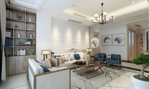 此项目整体风格为新中式。电视背景墙采用了大理石配以回字造型金属线条,两侧墙布搭配壁灯及花架摆件在灯光照映下更具意境。木质茶几,沙发背景墙为山水墨画的墙纸营造出一种朦胧美感,中式摆件及绿植的点缀给整个空间更添一丝韵味。