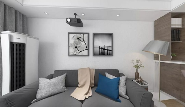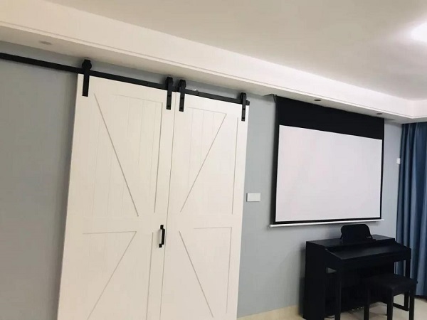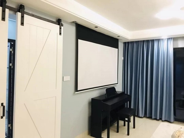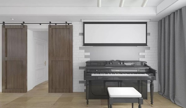 客厅摒弃了传统的电视背景墙+电视+电视柜,根据业主生活习惯及兴趣爱好等各方面条件以投影仪及幕布代替了电视,下方放置钢琴,将有限的空间发挥更大的作用。