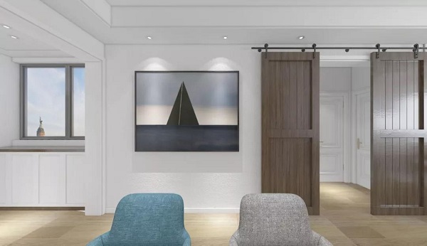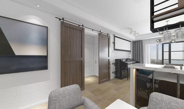 以谷仓门为分割将客餐厅及卧室隔开,起到一定装饰作用。关闭谷仓门时对主人休息区添加了一层保护色,更为注重业主隐私。当谷仓门敞开时又拓宽了视野,分割两个空间的同时在整个空间中起到一种神秘感,让人想对其身后的空间一探究竟。