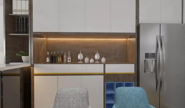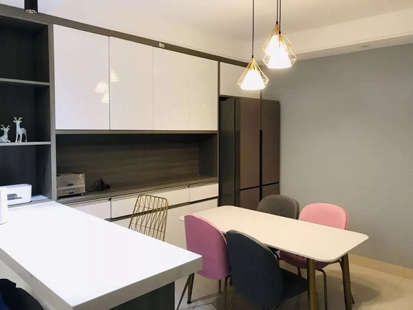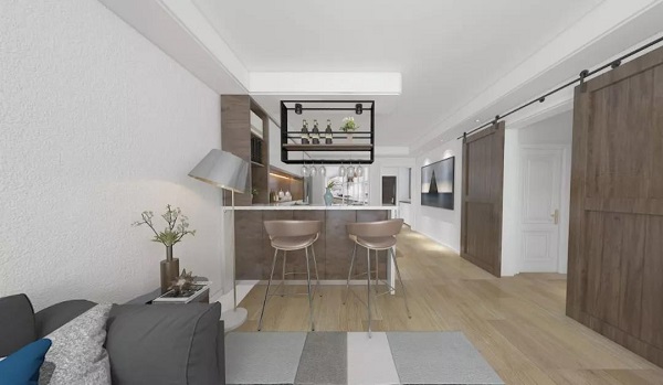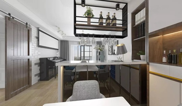 客厅与餐厅之间以吧台为界将两个巧妙地区域分割开来,迎合了现代年轻人追求潮流时尚的生活方式又具有一定的小资情调之感。用吧台来进行隔断,多出了一个功能区为家庭增添了酒吧的情趣的同时,也充分利用了空间。闲暇时间坐下来一品美酒也不失惬意。